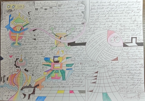 Armin A. Pangerl wurde 1965 in Bayreuth geboren und hatte eine glückliche Kindheit in Lörrach, Lahr und Mannheim. Er begann als Vorschulkind zu zeichnen und entwickelte seine Fähigkeiten sein ganzes Leben lang weiter. Nach dem Abitur 1983 absolvierte er bis 1985 eine Lehre als Betonbauer und nahm verschiedene Gelegenheitsjobs an, unter anderem als Bauarbeiter, Locher und LKW-Fahrer. Als Teenager kämpfte er mit Alkohol- und Drogenabhängigkeit und hatte mehrere psychotische Episoden. 1988 leistete er Militärdienst, nach seiner Entlassung arbeitete er bis 2000 im Sicherheitsdienst. Er studierte Kunstgeschichte, Geschichte und Mathematik, brach sein Studium jedoch 1997 nach der Hodenkrebs-Diagnose ab. Er machte eine Umschulung zum Multimediadesigner und arbeitete als Freiberufler, bevor er 2004 „Das Atelier Lahr“ gründete. Nachdem er 2008 an Speiseröhrenkrebs erkrankt war, wandte er sich dem Zeichnen und Schreiben zu. Für seine Zeichnungen verwendet er hauptsächlich Buntstifte und Kugelschreiber, die oft von Texten begleitet werden. Seine Zeichnungen weisen typischerweise geometrische Formen und Muster auf, und sein Schreiben ist zutiefst persönlich und erzählt direkt Geschichten und spiegelt Erfahrungen und Gefühle wider.
